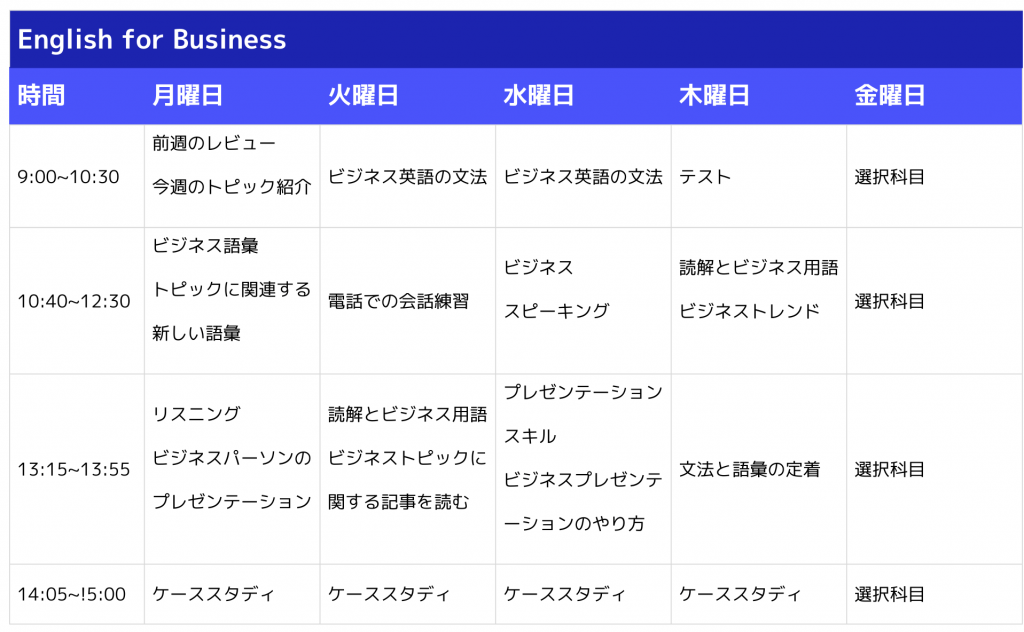 このコースは、英語で自信を持ってビジネスコミュニケーションを取りたい中級~中上級レベルの方向けのコースです。「ビジネス英語を学ぶ」だけでなく、「英語でビジネスそのものを学ぶ」といった実践型の内容が詰まったプログラムになっています。