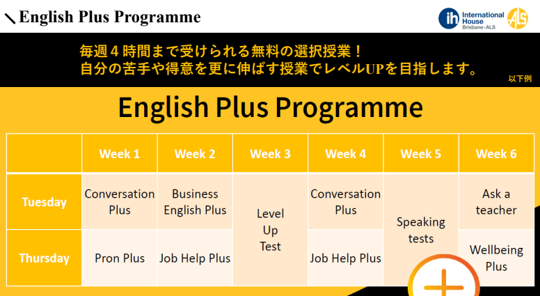 毎週火曜日と木曜日に「English Plus Programme」というプログラムがあり、無料で選択授業が受講できます。