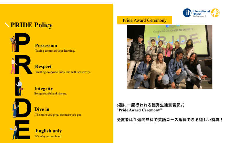 IHブリスベンでは6週間に1回、優秀な学生を表彰する「Pride Award Ceremony」という表彰式を開催しています。