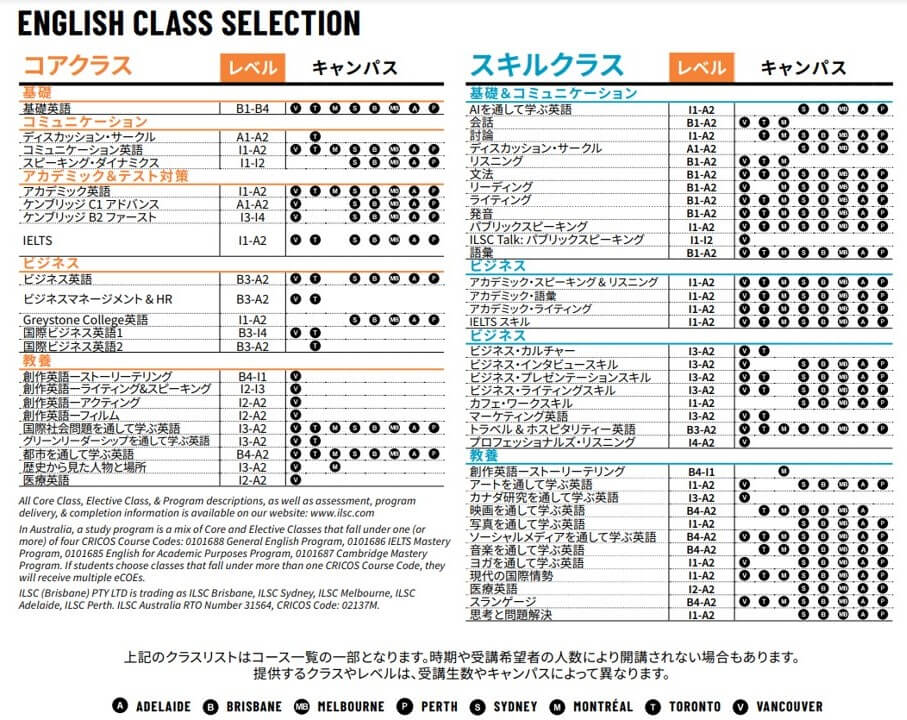 ※現時点でアイルランドでの選択授業リストが未発表のため、カナダ・オーストラリアの選択授業リストをサンプルで掲載しています