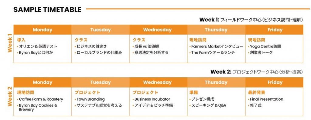 本プログラムは、インプットとアウトプットをバランスよく組み合わせた2週間構成となっています。前半でビジネスの考え方をバイロンベイの経営者から直接学び、後半では実際に自分のアイデアとして形にしていきます。