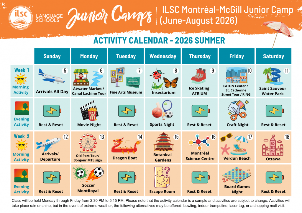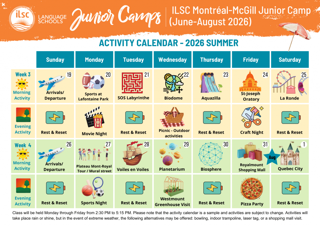 ILSCが主催するマギル大学ジュニアプログラムのアクティビティカレンダーは変更する場合がありますので、あらかじめご了承ください。